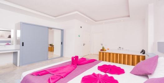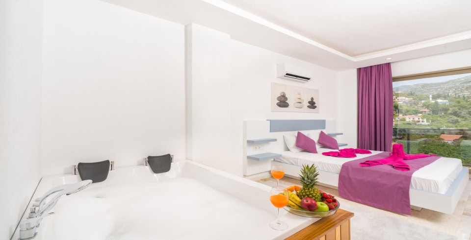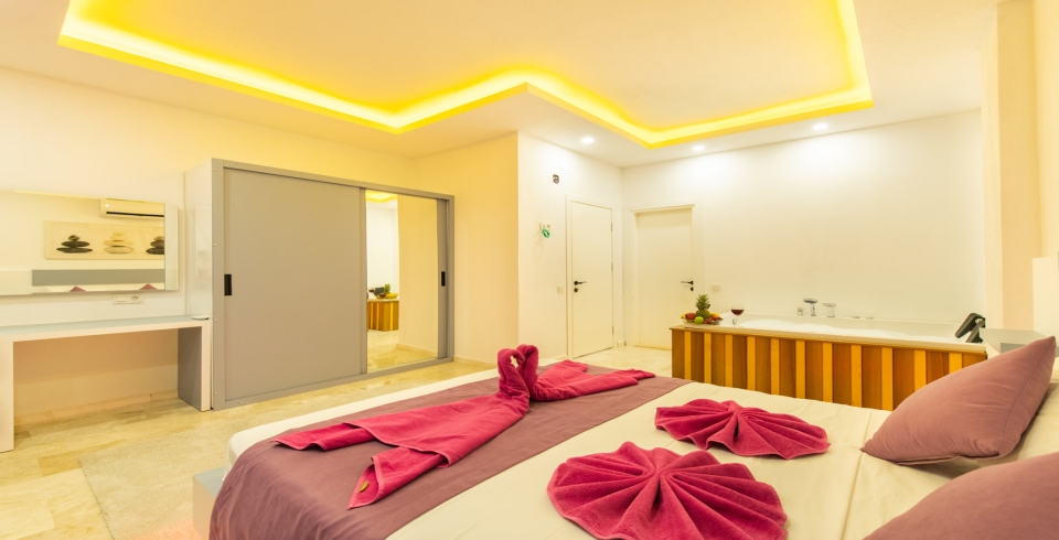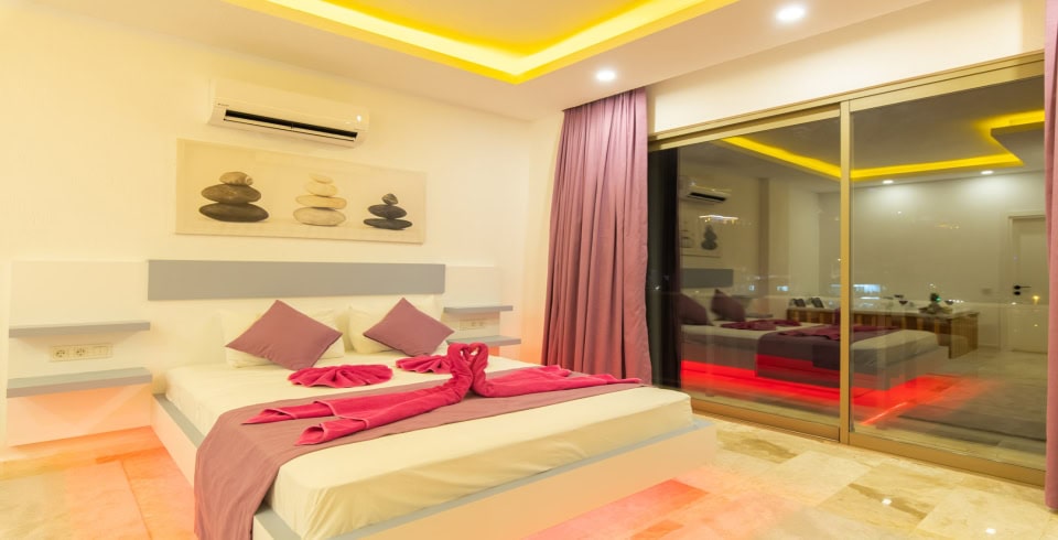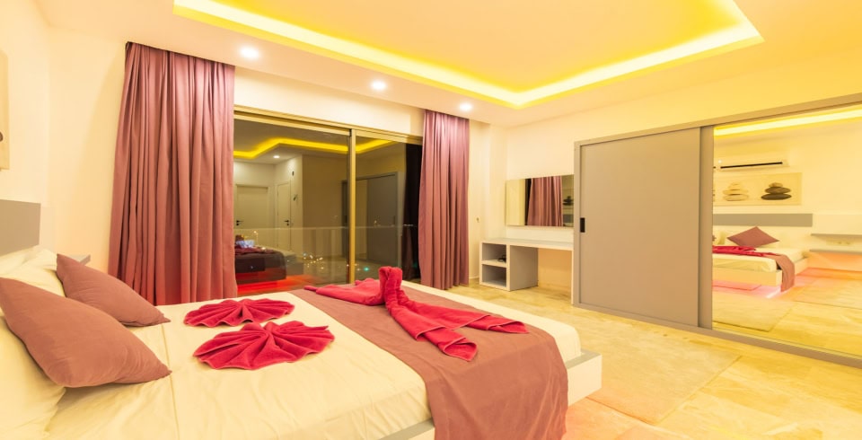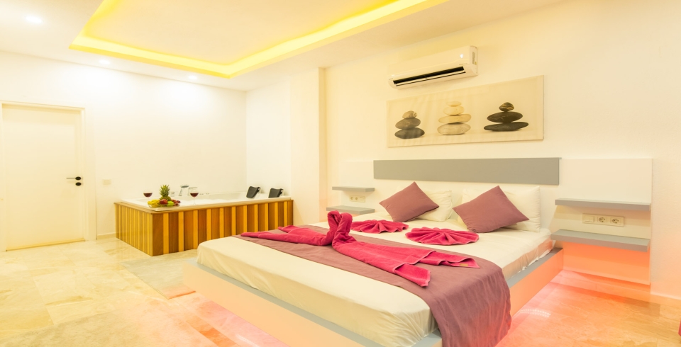 1. Yatak Odası: Çift kişilik yatak, klima, jakuzi, komodin, elbise dolabı, makyaj masası, banyo ve tuvalet bulunmaktadır.