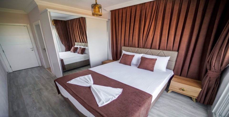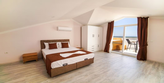 1.Yatak Odası: 1 adet çift kişilik yatak, Jakuzi, komodin, elbise dolabı, banyo ve lavabo bulunmaktadır.