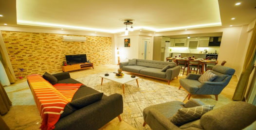 Salon: Villa salonunda konforlu oturma grubu, klima, TV, internet, uydu alıcı, yemek masası, sehpa bulunmaktadır.