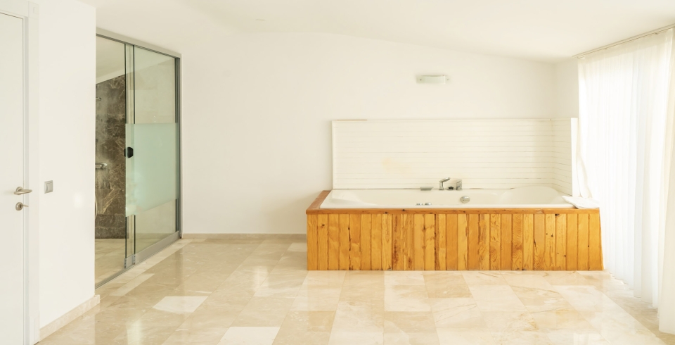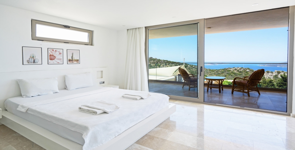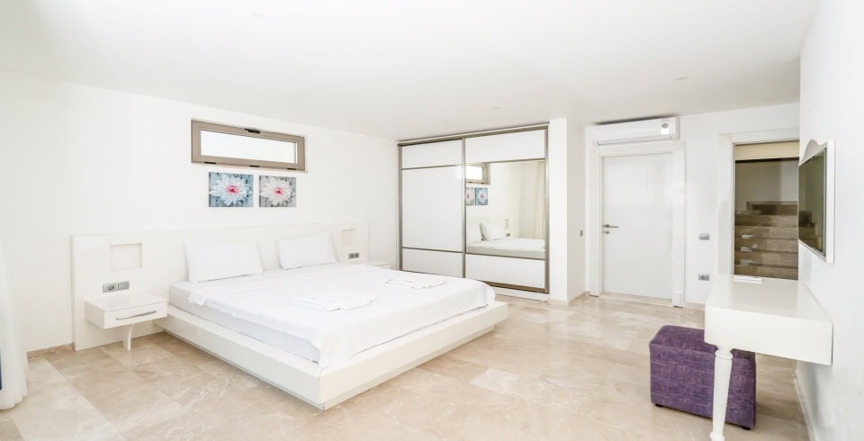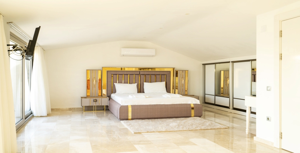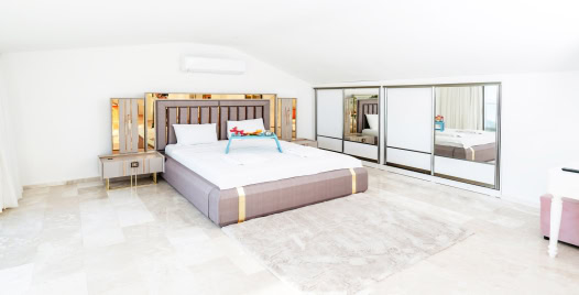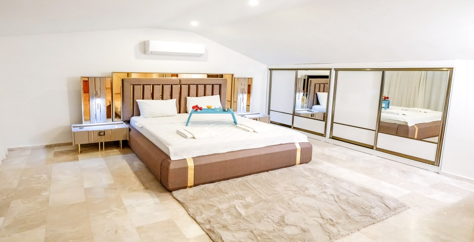 1.Yatak Odası: 1 adet Çift kişilik yatak, klima, komodin, makyaj masası, elbise dolabı, banyo ve tuvalet bulunmaktadır. Havuz terasına çıkış yapılabilmektedir.