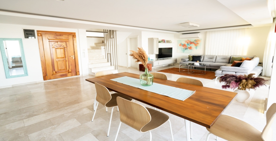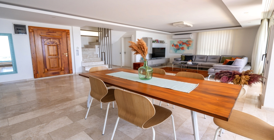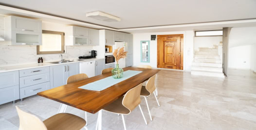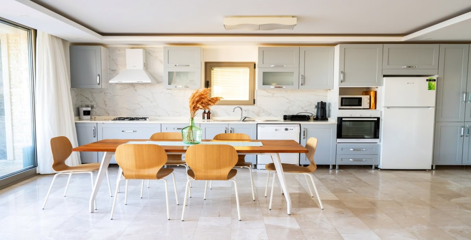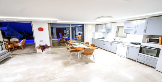 Mutfak: Modern Amerikan mutfakta buzdolabı, bulaşık makinası, çamaşır makinası, yemek masası, fırın, 4’lü ocak, kettle, 6 kişilik yemek masası, yemek takımları, çatal ce bıçak takımları, tencere ve tava takımları, bardaklar bulunmaktadır. Havuz terasına çıkış yapılabilmektedir.