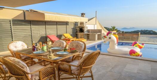 Bahçe: Bahçe içerisinde şezlonglar, güneş şemsiyesi, taş BBQ, özel bahçe, özel havuz, güneşlenme alanı, sandalye ve masa bulunmaktadır.