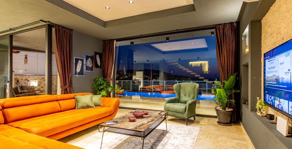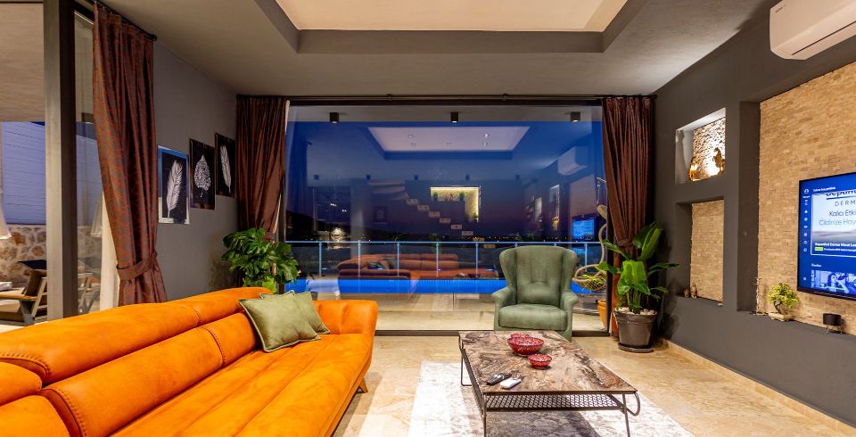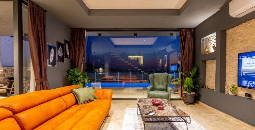 Salon: Villa salonunda konforlu oturma grubu, klima, TV, internet, uydu alıcı, yemek masası, sehpa bulunmaktadır.