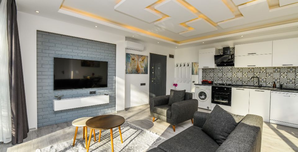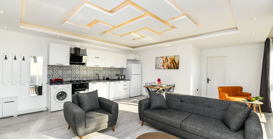 Mutfak : Amerikan mutfak, buzdolabı, bulaşık makinesi, 4´lü ocak, yemek masası ve sandalyeleri, mutfak araç ve gereçleri bulunur.