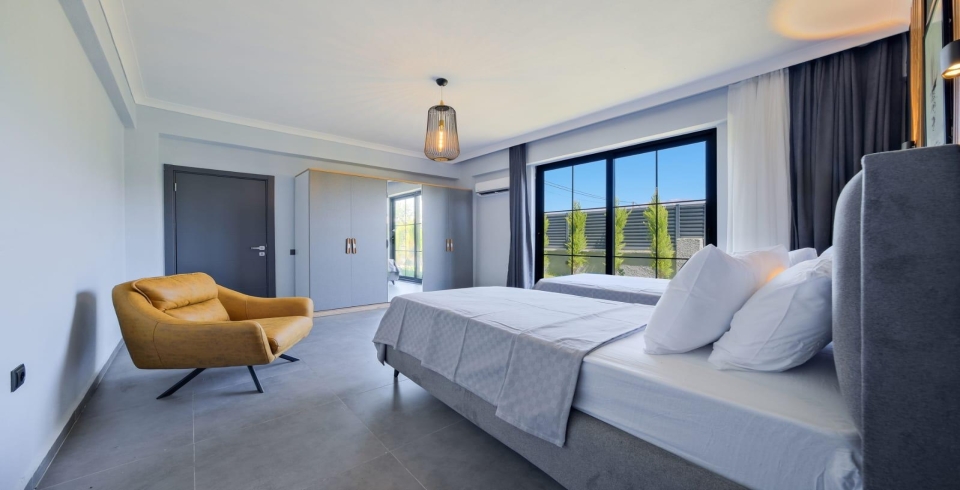 1. Yatak Odası: 1 çift kişilik yatak, komodin, banyo/WC, klima, elbise dolabı, makyaj masası ve berjer bulunmaktadır.