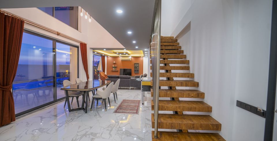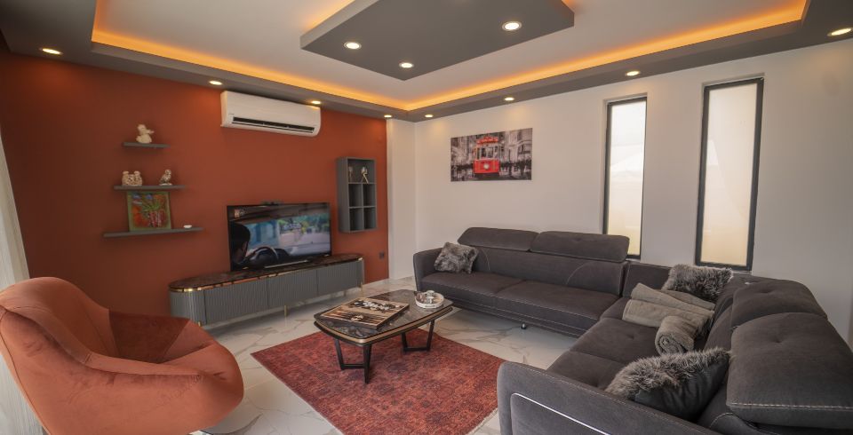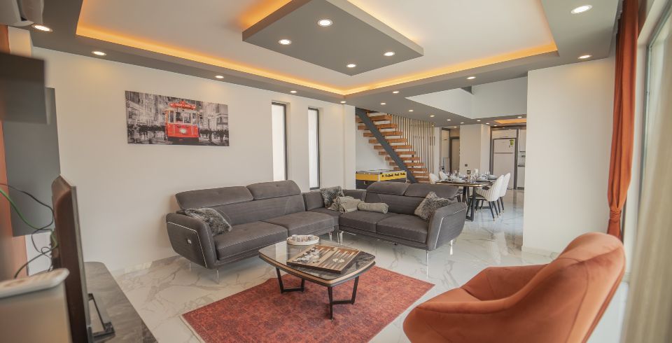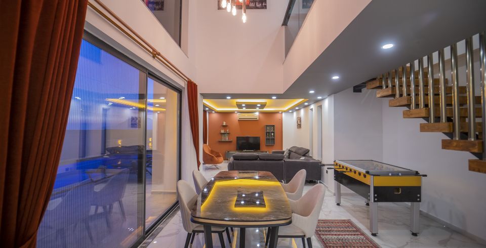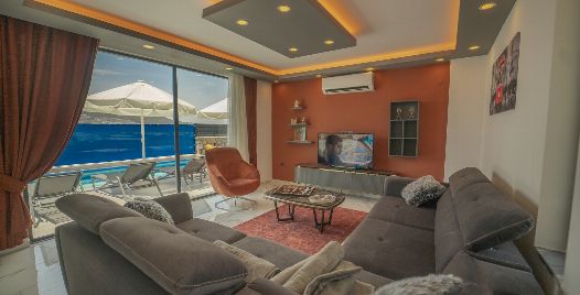 Salon: Villa salonunda konforlu oturma grubu, klima, TV, internet, uydu alıcı, yemek masası, sehpa bulunmaktadır.