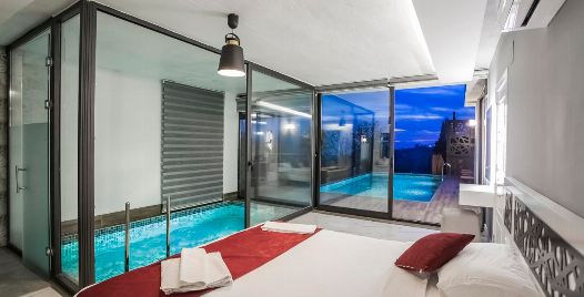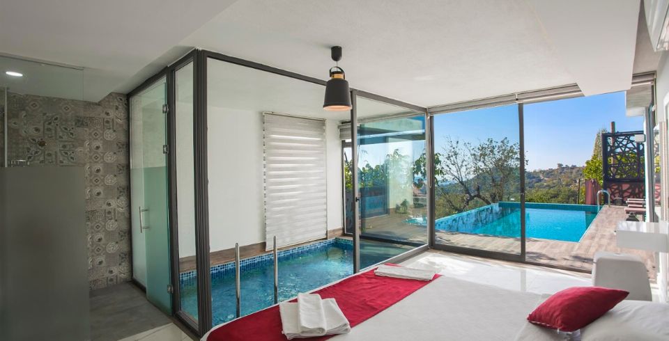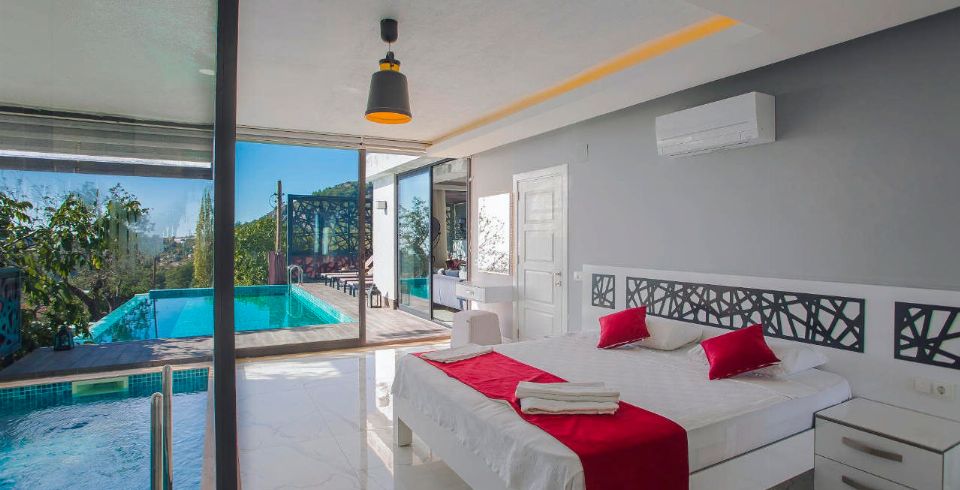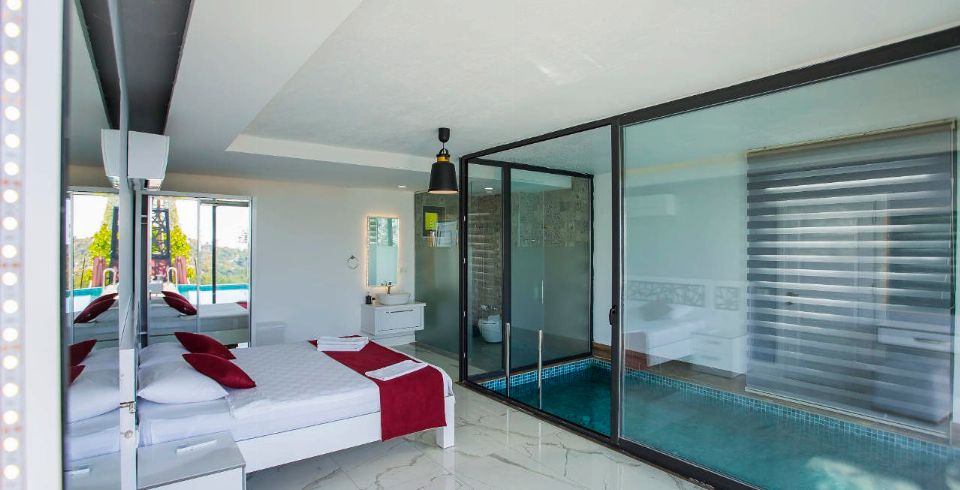 Yatak odası 1: En-süit yatak odasında çift kişilik yatak, makyaj masası, komodin, elbise dolabı, klima, kapalı havuzlu ebeveyn banyosu ve havuz terasına çıkış bulunmaktadır.