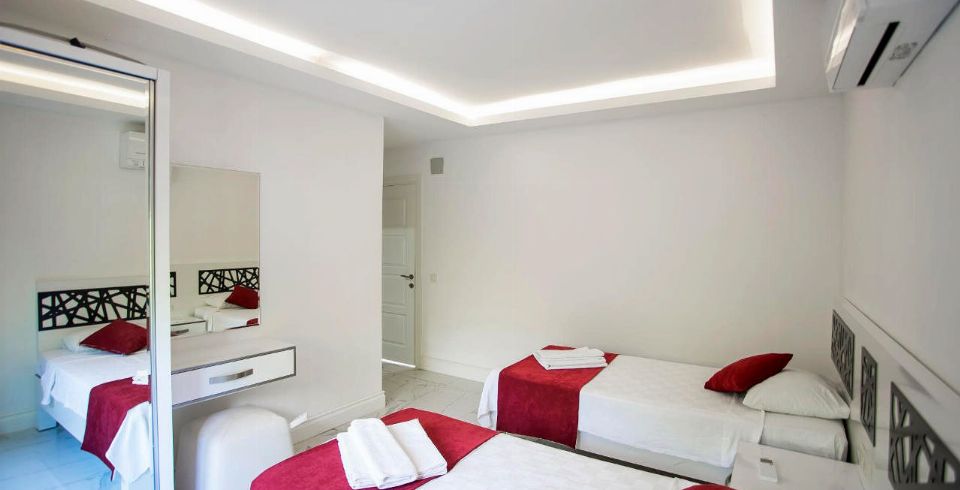 Yatak odası 2: En-süit yatak odasında 2 adet tek kişilik yatak, komodin, makyaj masası, elbise dolabı, klima, banyo ve tuvalet bulunmaktadır.