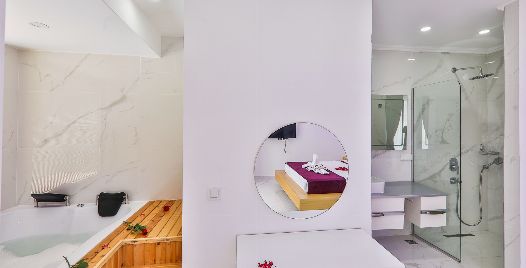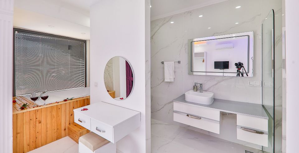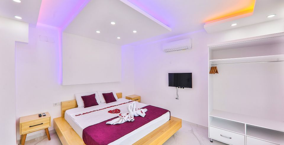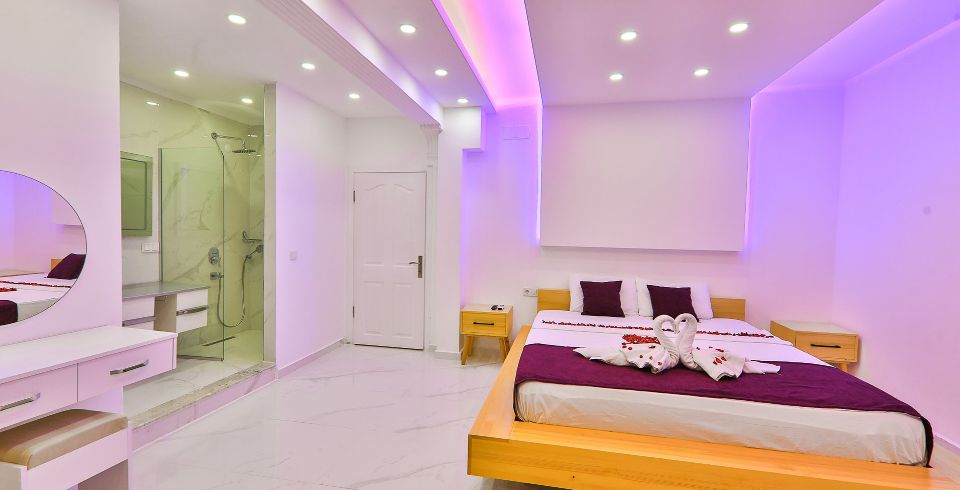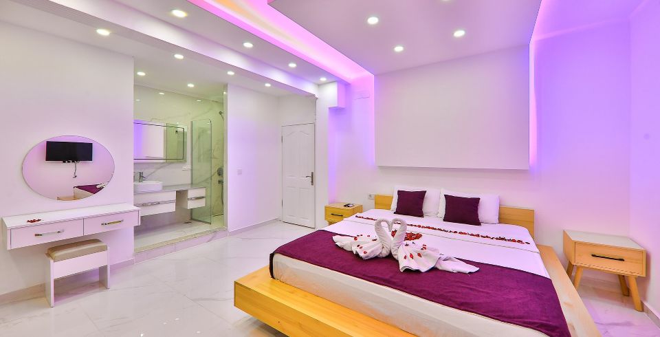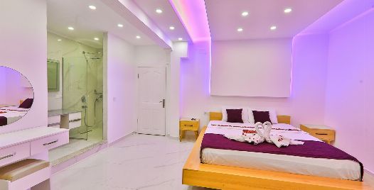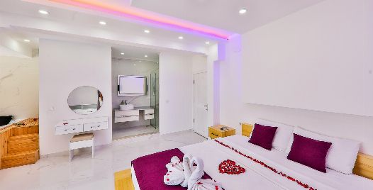 1: Yatak Odası: Çift kişilik yatak, klima, jakuzi, TV, komodin, elbise dolabı, makyaj masası, TV banyo ve tuvalet bulunmaktadır.