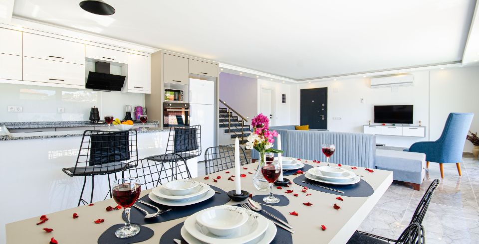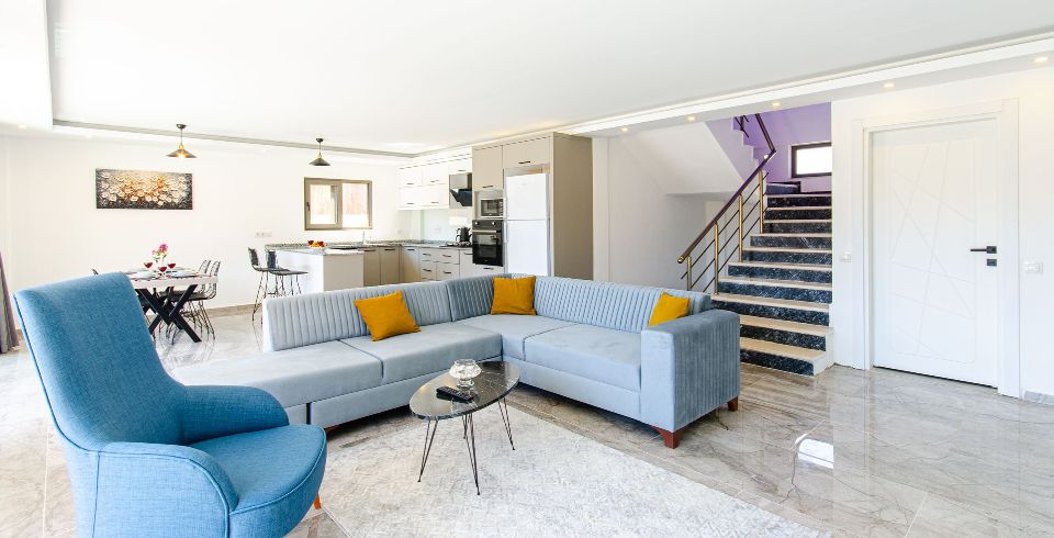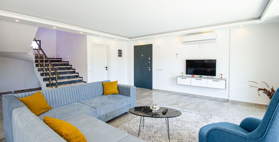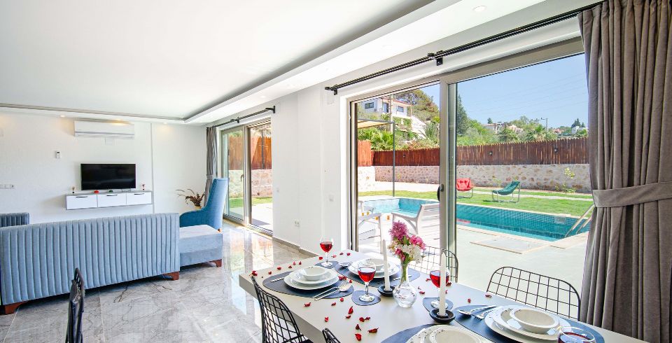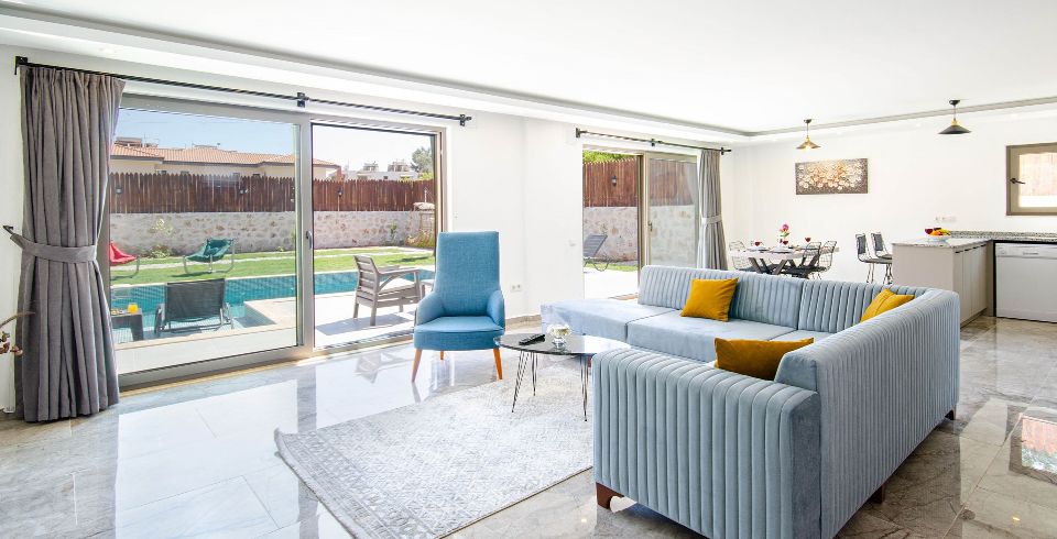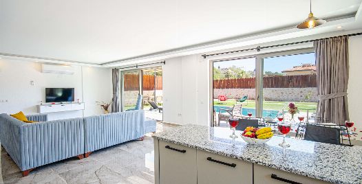 Salon: Villa salonunda konforlu oturma grubu, klima, TV, internet, uydu alıcı, yemek masası, sehpa bulunmaktadır.