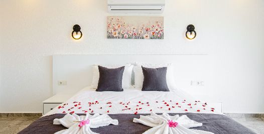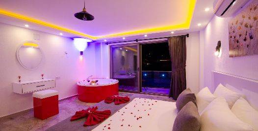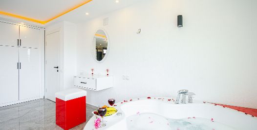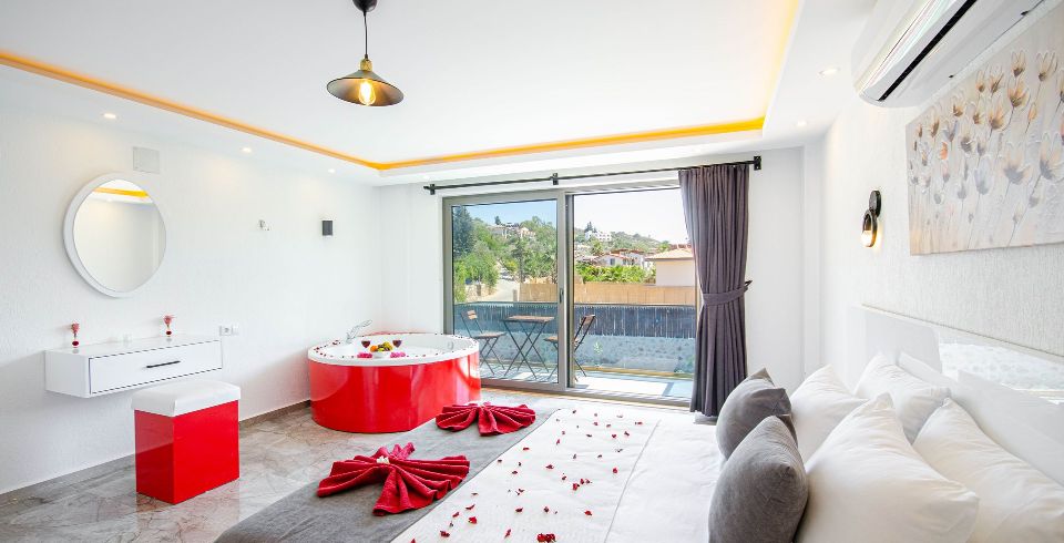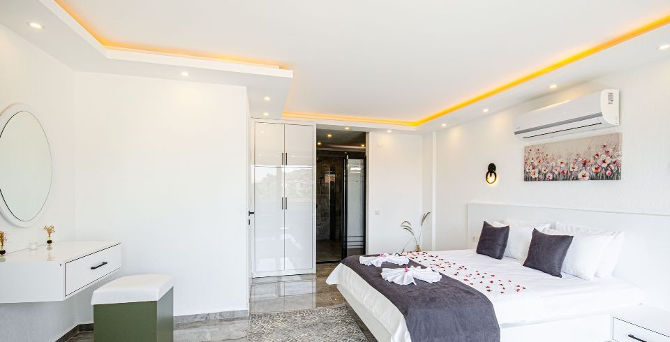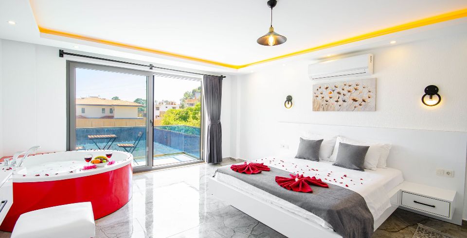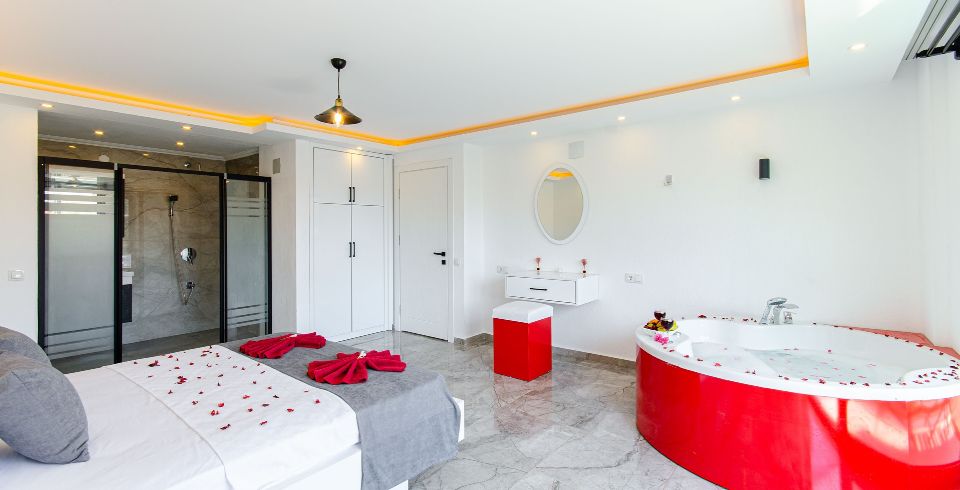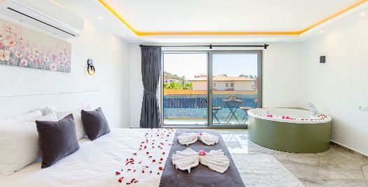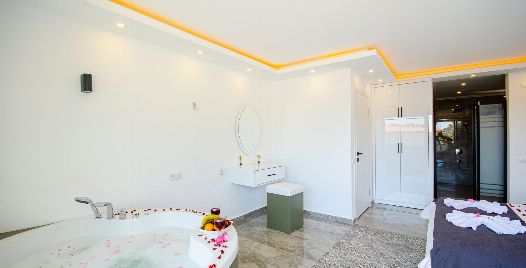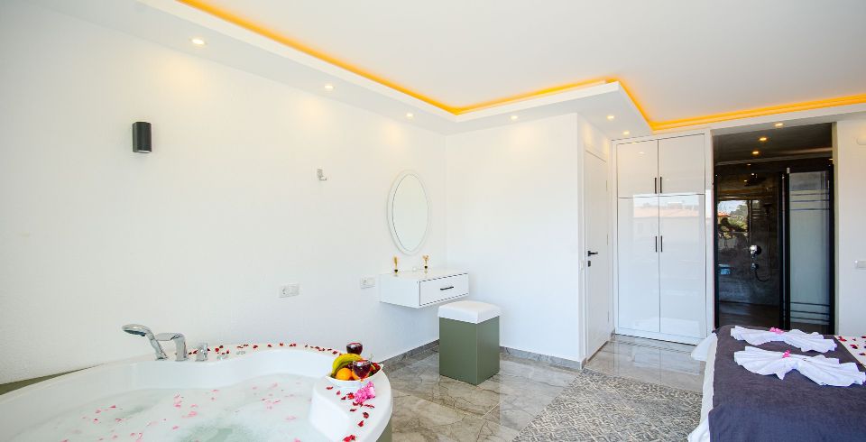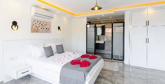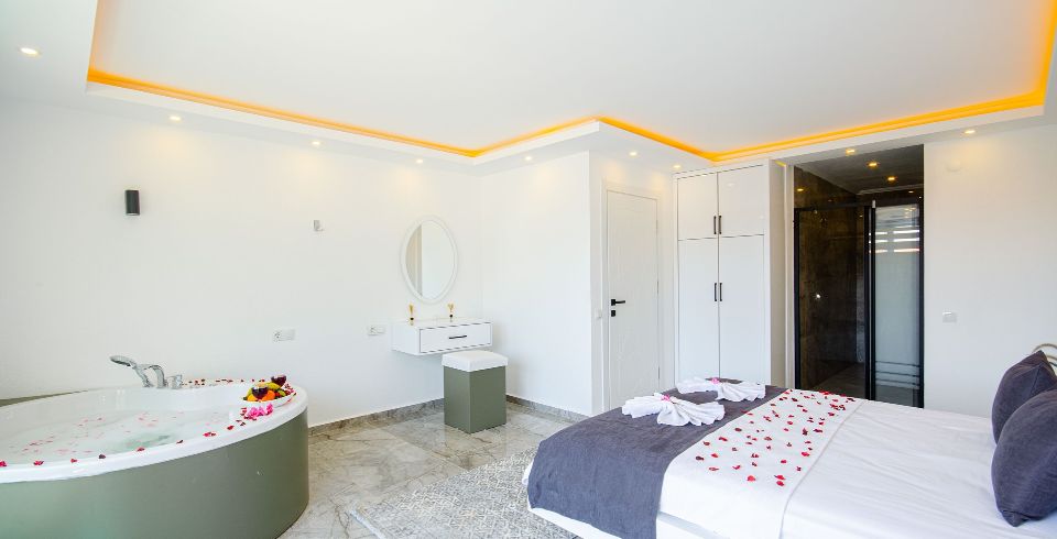 2: Yatak Odası: Çift kişilik yatak, klima, jakuzi, komodin, elbise dolabı, makyaj masası banyo ve tuvalet bulunmaktadır.