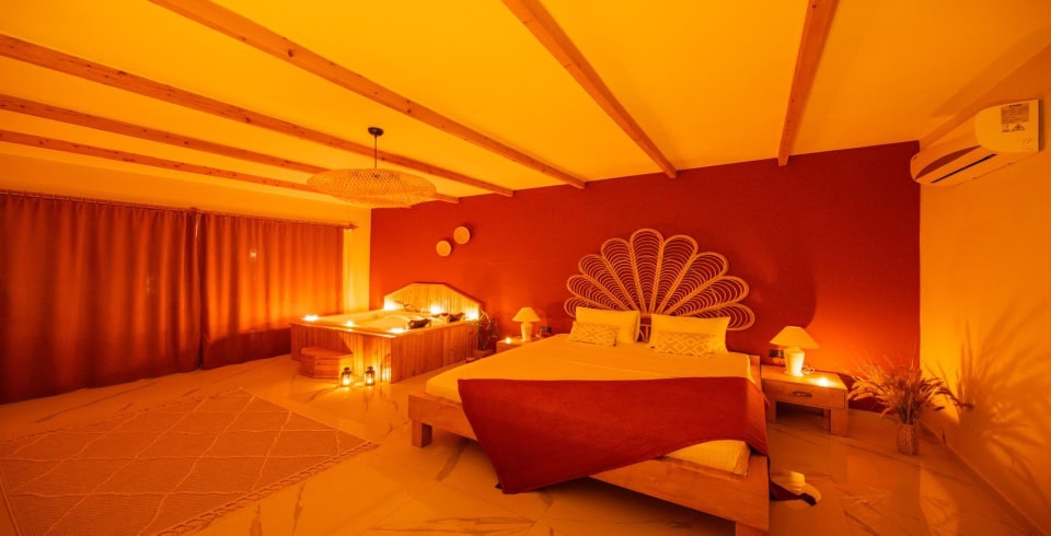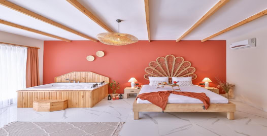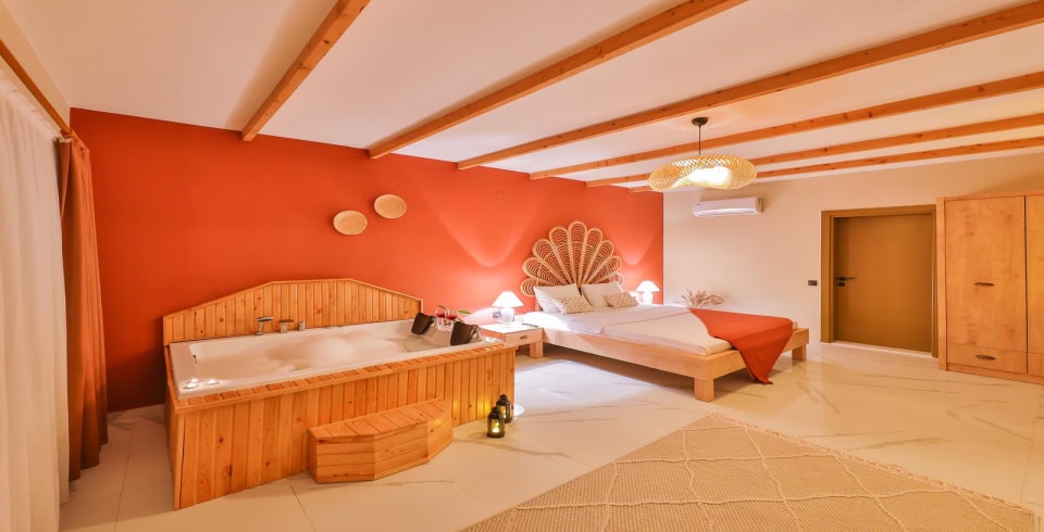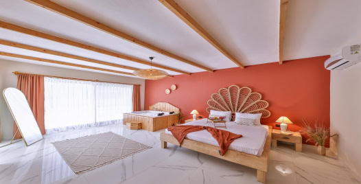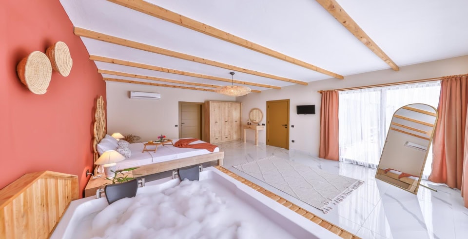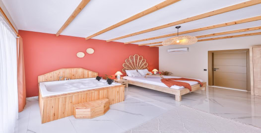 1. Yatak Odası : Çift kişilik yatak odası, Jakuzi, klima, elbise dolabı, makyaj masası, komodin, banyo ve WC bulunmaktadır.