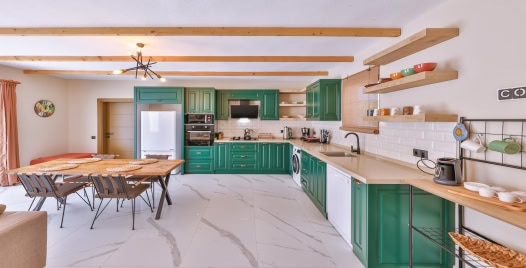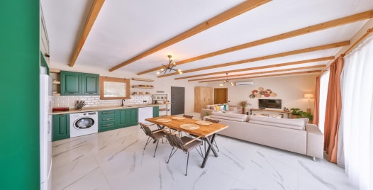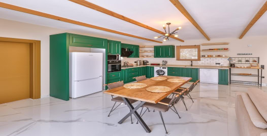 Mutfak : Amerikan açık mutfak ve salona sahip villamızın mutfağında buzdolabı, bulaşık makinası, ankastre ocak, fırın, mikrodalga, 4'lü ankastre ocak, kettle, çamaşır makinası, yemek masası ve temel mutfak araç ve gereçleri bulunmaktadır.