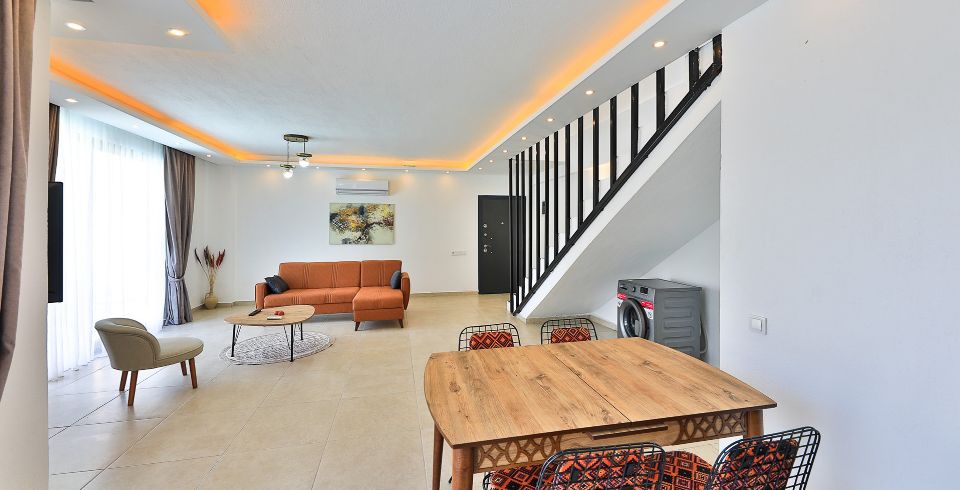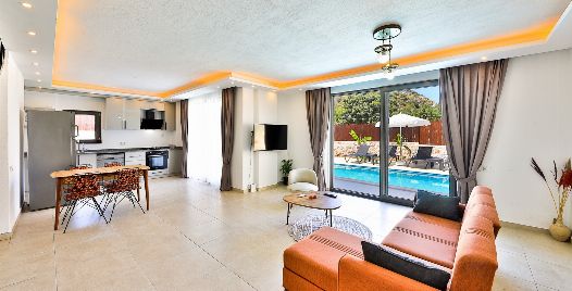 Salon: Villa salonunda konforlu oturma grubu, klima, TV, internet, uydu alıcı, yemek masası, sehpa bulunmaktadır.