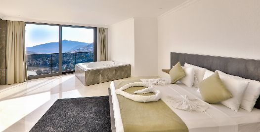 1. Yatak Odası: Süit aile yatak odası olup, 1 adet çift kişilik yatak, jakuzi, komodin, makyaj masası, elbise dolabı, klima, ve banyo tuvalet bulunmaktadır.