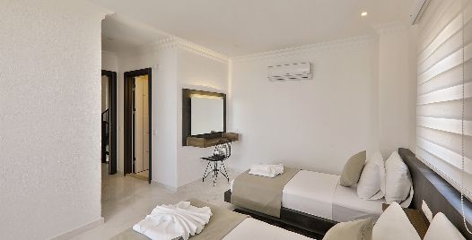 2. Yatak Odası: Süit aile yatak odası olup, 2 adet tek kişilik yatak, , komodin, makyaj masası, elbise dolabı, klima, ve banyo tuvalet bulunmaktadır.