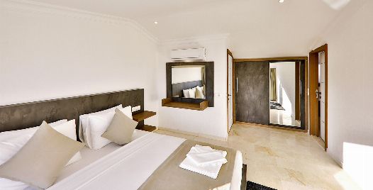 6. Yatak Odası: Süit aile yatak odası olup, 1 adet çift kişilik yatak, komodin, makyaj masası, elbise dolabı, klima, ve banyo tuvalet bulunmaktadır.