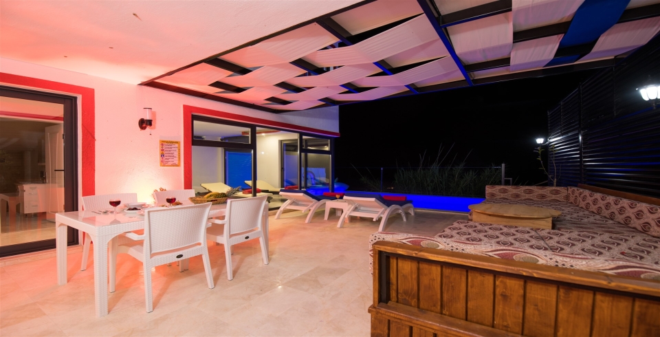 Havuz ve Bahçe: Villa Macera Kalkan geniş bahçesi ve havuz terası ile siz misafirlerimizin rahatlığı için havuz terasımızda ve bahçemizde şezlong, güneşlenme şemsiye, taştan barbekü, köşk, yemek masası ve sandalyeleri ve oturma grubu bulunmaktadır.