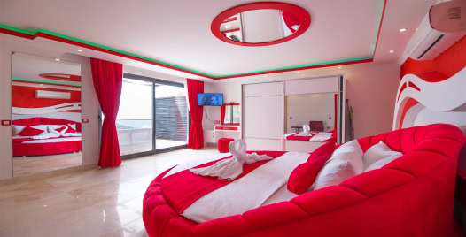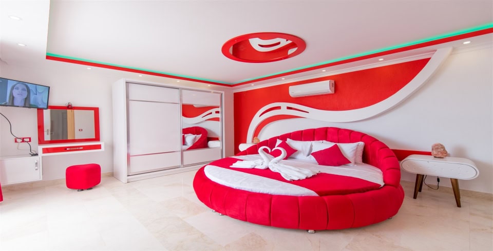 1. Yatak Odası : 1 adet çift kişilik yatak, elbise dolabı, saç kurutma makinası, klima, TV, balkon, sauna, banyo ve tuvalet vardır. Ayrıca diğer odamızda balayı çiftleri için tasarlanmış olan özel jakuzili havuzumuz bulunmaktadır.