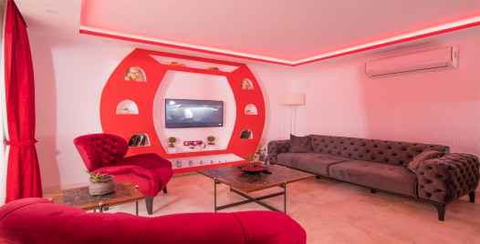 Salon : Salon kısmında; Oturma grubu, televizyon, klima, sehpa, internet ve havuz terasına çıkış bulunmaktadır.
