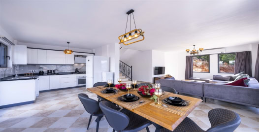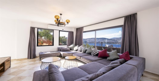 Salon : Modern ve lüks dizayna sahip salon içerisinde konforlu oturma grubu, TV, klima ve internet yer almaktadır. Salondan havuz terasına geçiş vardır.