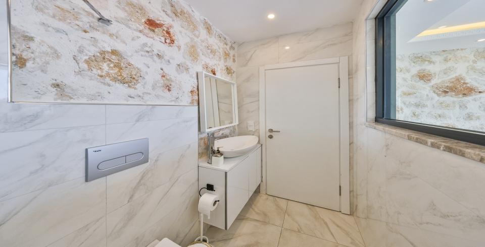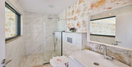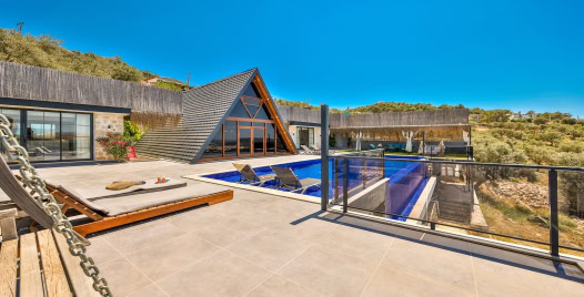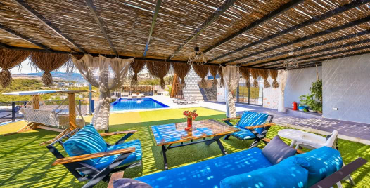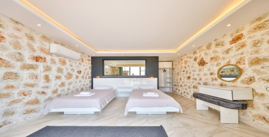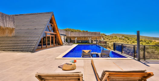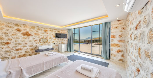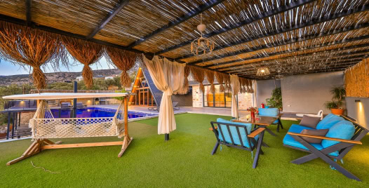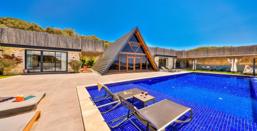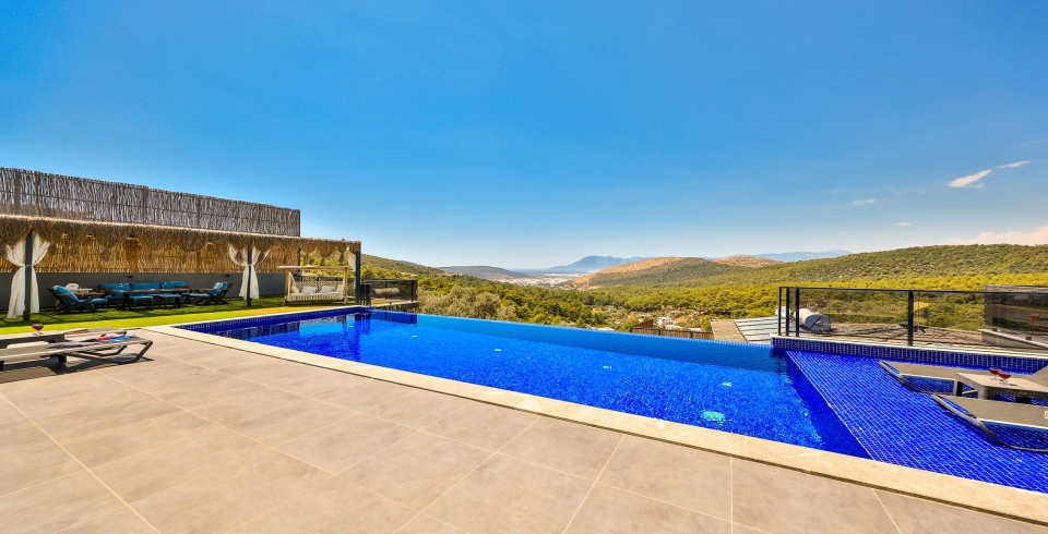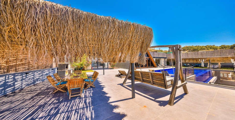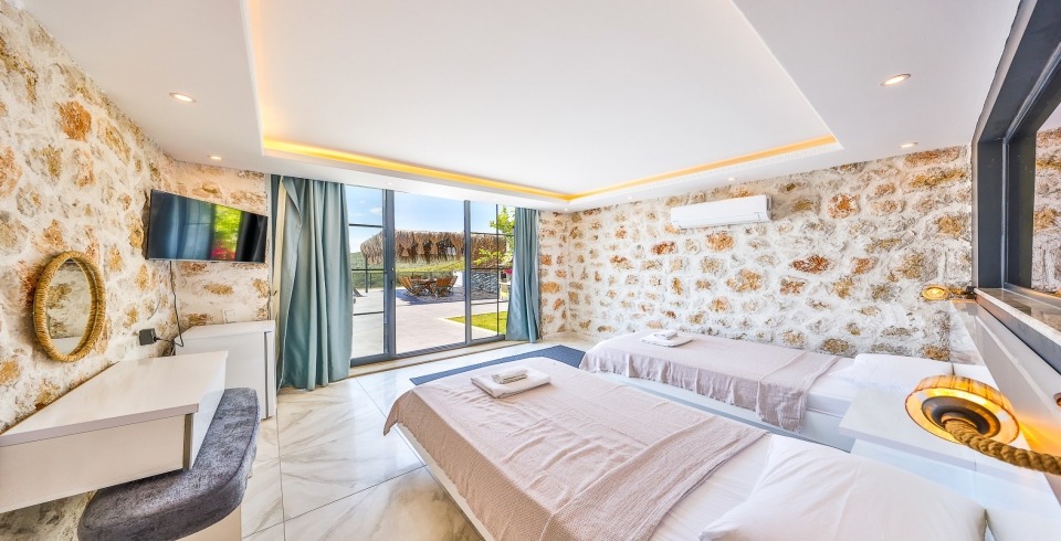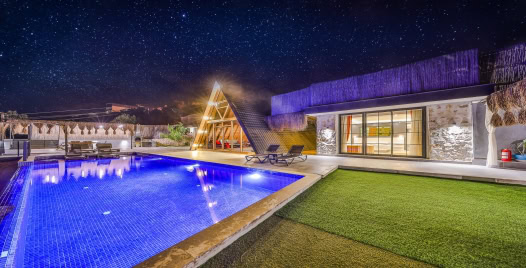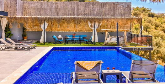 Salon : Modern ve lüks dizayna sahip salon içerisinde konforlu oturma grubu, TV, DVD oynatıcı, klima ve internet yer almaktadır. Salondan havuz terasına geçiş vardır.