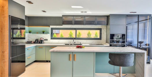 Mutfak : Modern Amerikan mutfak içerisinde yemek masası, mama sandalyesi, buzdolabı, bulaşık makinası, fırın, ocak, mikrodalga fırın, tost makinası, yemek masası, yemek takımları, çatal ve bıçak takımları, tencere ve tava takımları, bardaklar bulunmaktadır.