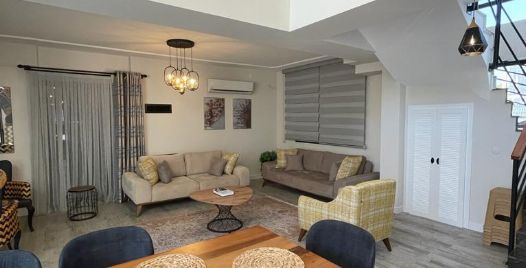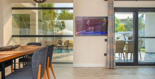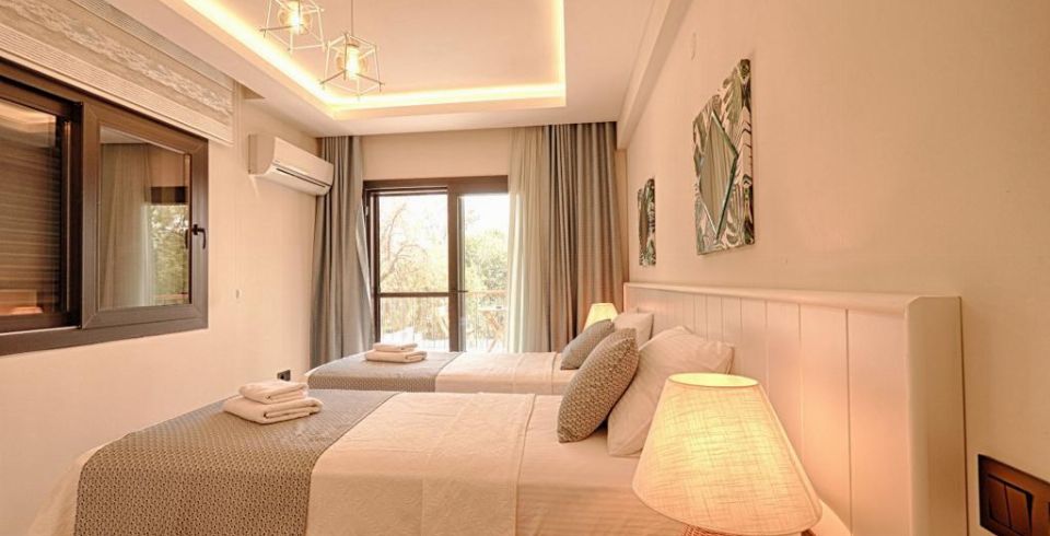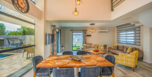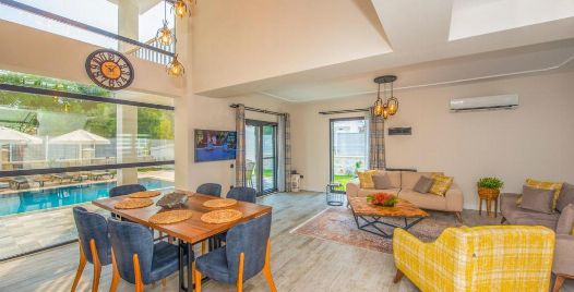 Salon : Konforlu oturma grubu, LCD TV, klima ve wi-fi modem, uydu sistemi mevcuttur. Havuz terasına çıkış bulunmaktadır.
