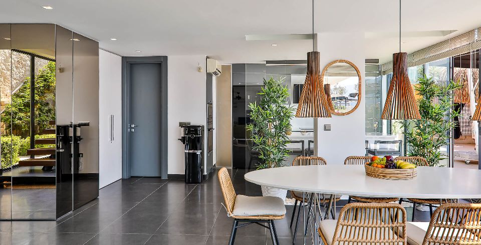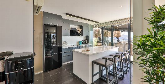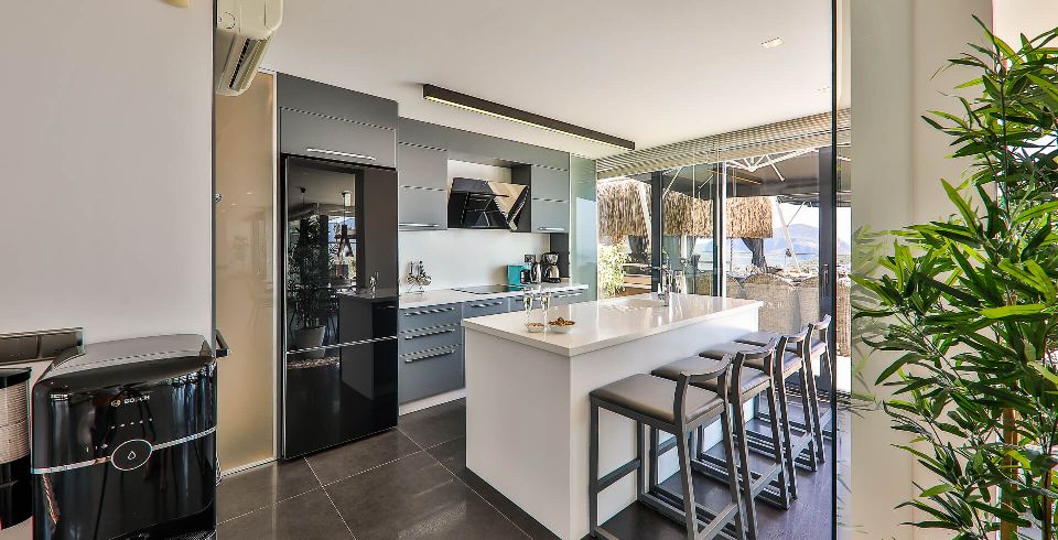 Mutfak : Villa içinde modern Amerikan mutfak bulunmaktadır. Mutfakta mikrodalga fırın, bulaşık makinası, ankastre fırın, buzdolabı, çamaşır makinası, ankastre 4’lü ocak, elektrikli su ısıtıcı kettle, ekmek kızartma makinası, tencere ve tava takımı, 8 kişilik yemek takımı, kaşık ve çatal seti ve bardaklar bulunmaktadır. Havuz başına geçiş bulunmaktadır.