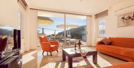 Salon : Villa Manolya’nın salonunda sizi şık bir oturma grubu ile klima, TV, internet, uydu, ütü, ütü masası, koltuk, sehpa ile ferah bir salon bekliyor olacaktır. Havuz terasına çıkış yapılmaktadır. Salonumuz havuz ve deniz manzaralıdır.