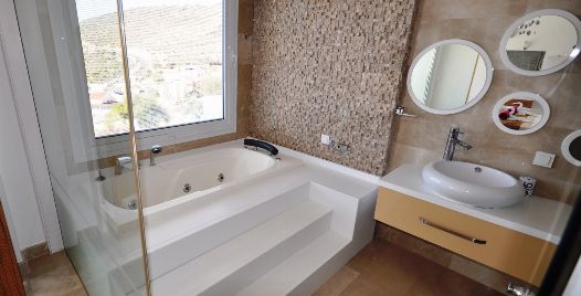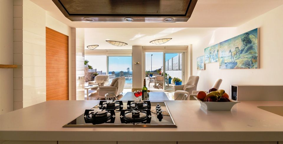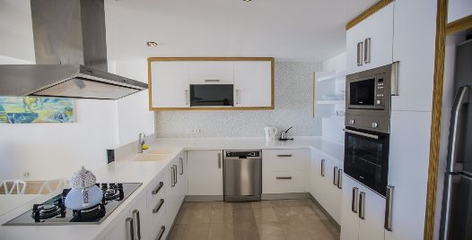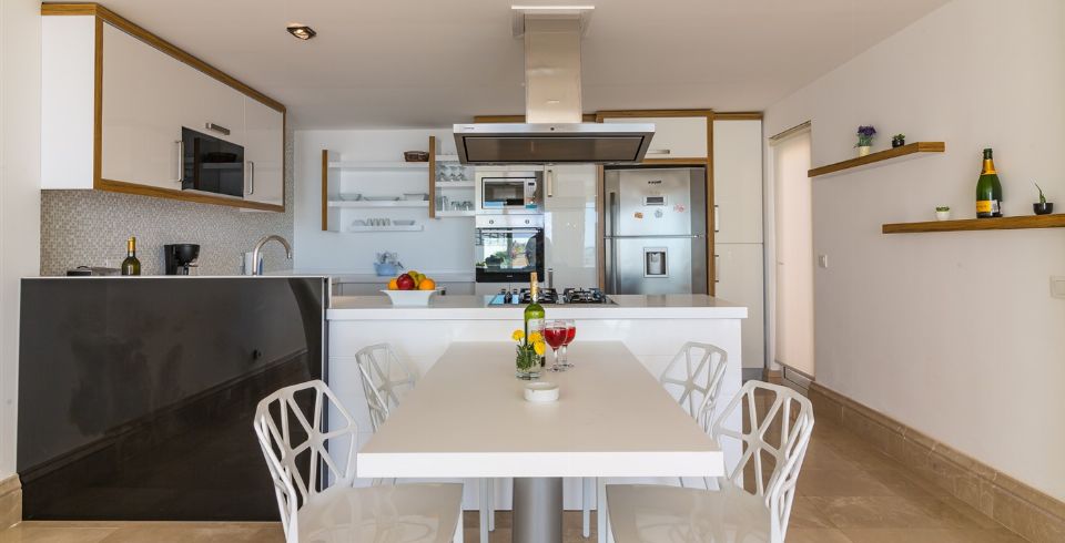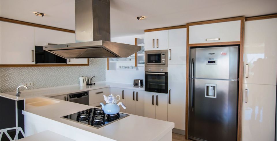 Mutfak : Modern açık Amerikan mutfak ve salon havuz terasında bulunmakta olup havuza ulaşmak gayet kolaydır. Mutfakta buzdolabı, bulaşık makinası, fırın, ketil, ekmek kızartma, kahve makinası, mikro dalga, yemek masası ve mutfak araç ve gereçleri bulunmaktadır.
