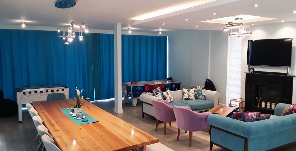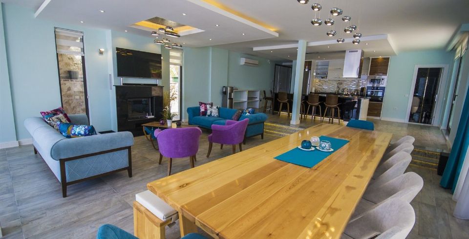 İç mekânda modern ve ferah bir tasarım hâkimdir. Zemin katta geniş oturma odası, 12 kişilik yemek masası ve tam donanımlı mutfak bulunur. Eğlence sever misafirler için sinema odası, PlayStation, langırt, masa tenisi ve hava hokeyi alanı mevcuttur.