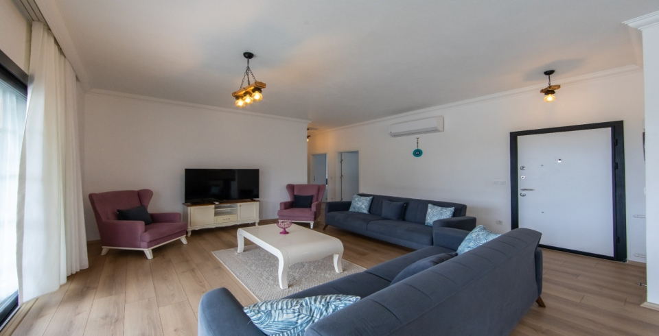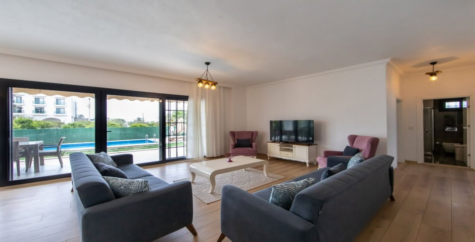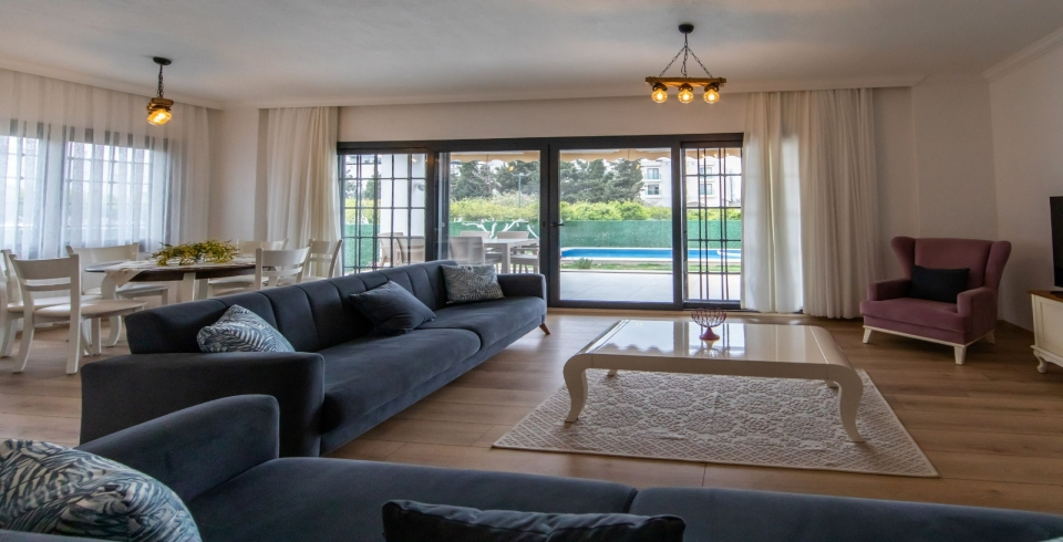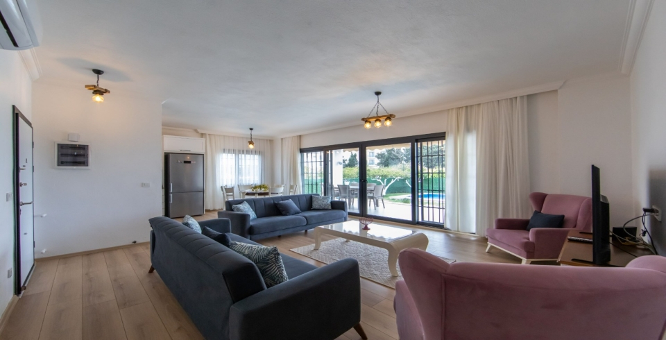Salon : Villamızın Salonunda oturma grubu, TV, uydu, internet, klima, ve havuz terasına çıkış yapılabilmektedir.