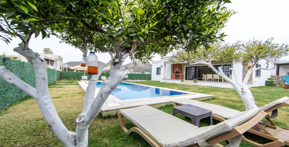 Bodrum Turgutreis'te Denize yürüyüş mesafesinde yer alan Kiralık Yazlık Villamız, toplamda 3 yatak odalı, 2 banyolu ve çocuklarla birlikte 6 kişilik konaklama kapasitesine sahip olup çekirdek aileler için ideal bir seçimdir. Özel havuz ve bahçenin etrafı dışarıdan görünmeyecek şekilde çevrilmiş olan tek katlı yazlık villamız Milas Bodrum Havalimanı’na 55 dakika, Turgutreis Marina’ya 8 dakika, Yalıkavak Marina’ya 20 dakika mesafede konumlanmaktadır.