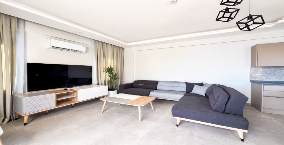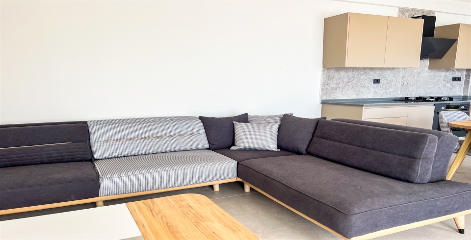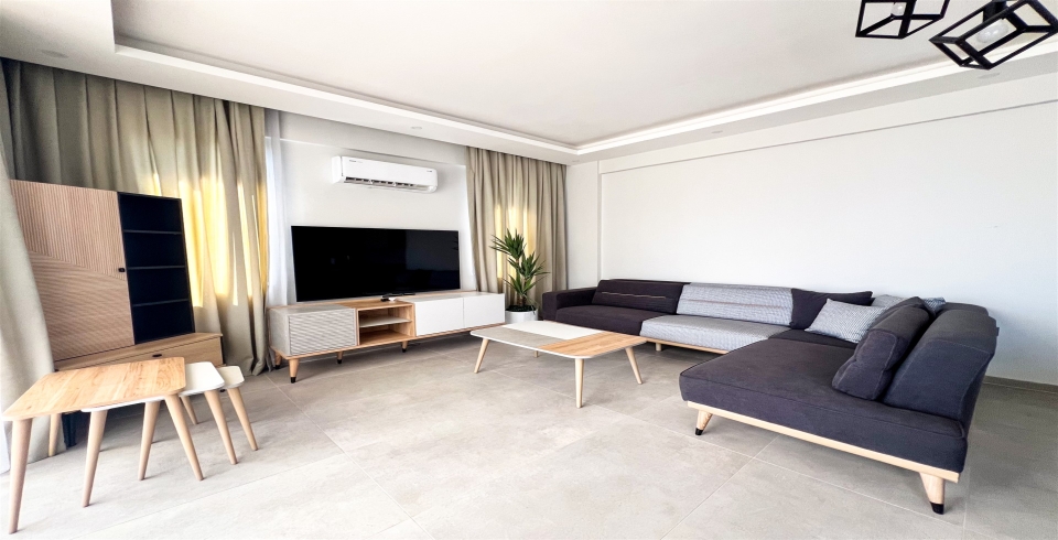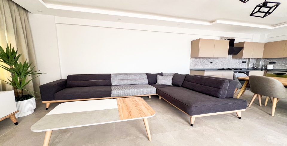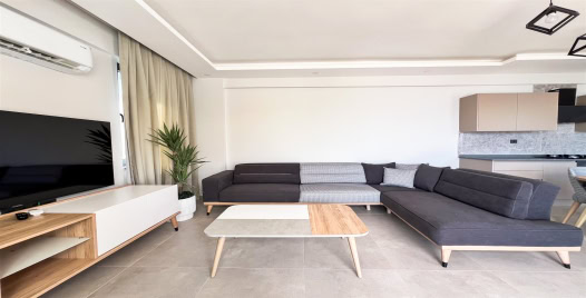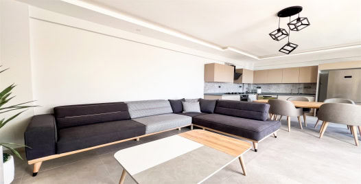 Salon: Özenle döşenmiş salon, modern koltuklar, yemek masası, LCD TV ve klima bulunmaktadır.