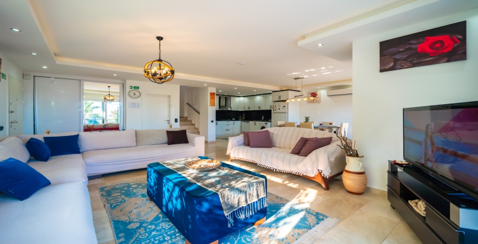 Salon : Deniz ve Doğa manzaralı salon, oturma grubu, 8 kişilik yemek masası, uydu ve TV( LCD), klima