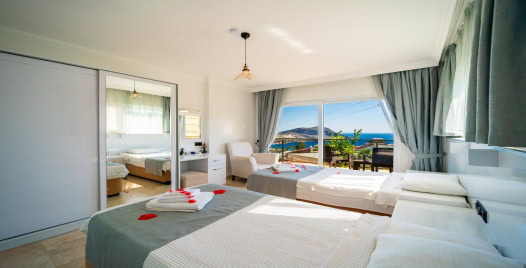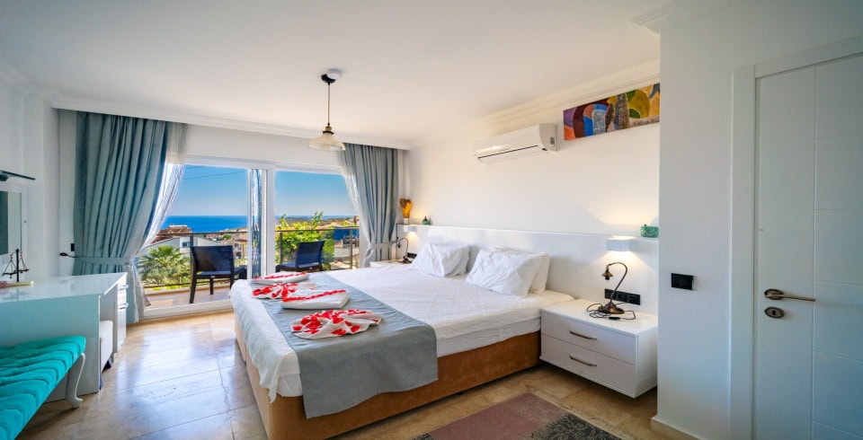 1. Yatak Odası : Süit aile için çift kişilik yatak, klima, banyo, balkon, elbise dolabı, makyaj masası, TV (LCD), komodin, saç kurutma makinası