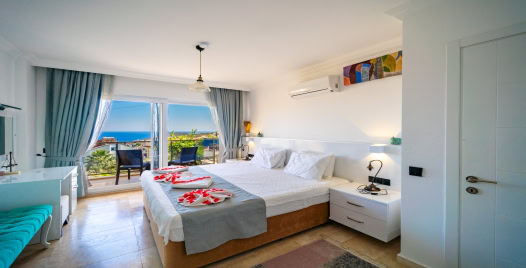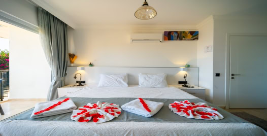 2. Yatak Odası : Süit aile için çift kişilik yatak, klima, banyo, teras, elbise dolabı, makyaj masası, komodin, saç kurutma makinası