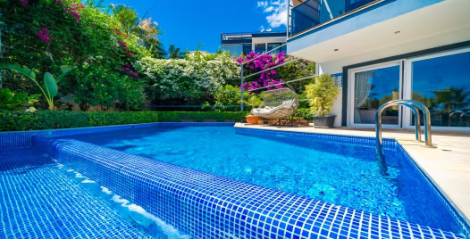Havuz ve Bahçe : Özel yüzme havuzu ve bahçeye sahip Villa Melisa geniş güneşlenme alanı bulunmaktadır. 6 adet şezlong ve şemsiye, 6 kişilik yemek masası, oturma grubu, barbekü