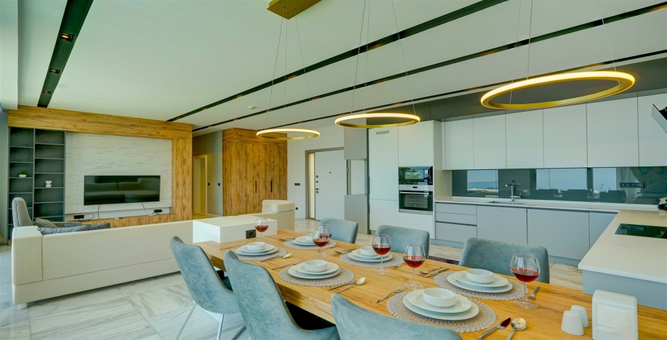 Mutfak : Amerikan mutfak, bulaşık makinası, buzdolabı, ankastre fırın, mikrodalga fırın, ankastre 4'lü ocak, su ısıtıcısı, tencere ve tava takımı, yemek takımı, kaşık çatal bıçak takımı, bardak takımı, yemek masası, sandalyeler ve tost makinesi bulunmaktadır.