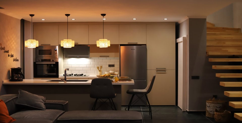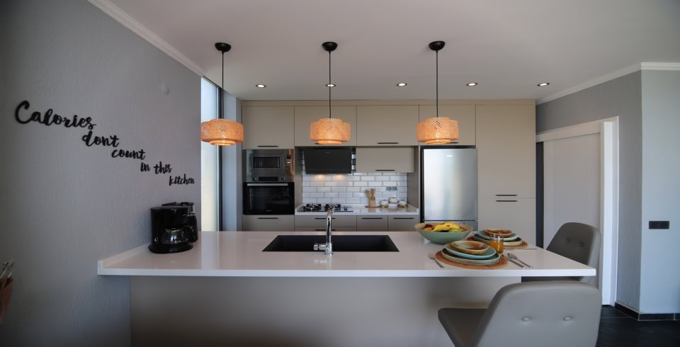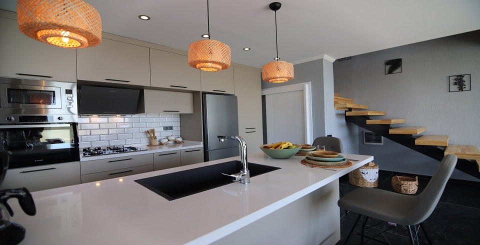 Mutfak : Modern Amerikan mutfak içerisinde 2 kişilik yemek masası, buzdolabı, bulaşık makinası, fırın, ocak, tost makinası, yemek masası, yemek takımları, çatal ve bıçak takımları, tencere ve tava takımları, bardaklar bulunmaktadır.