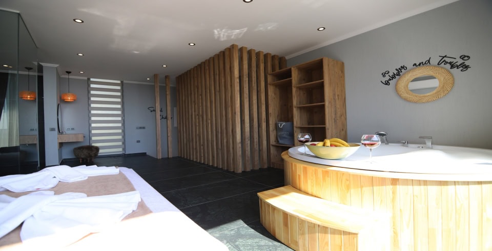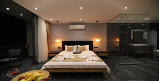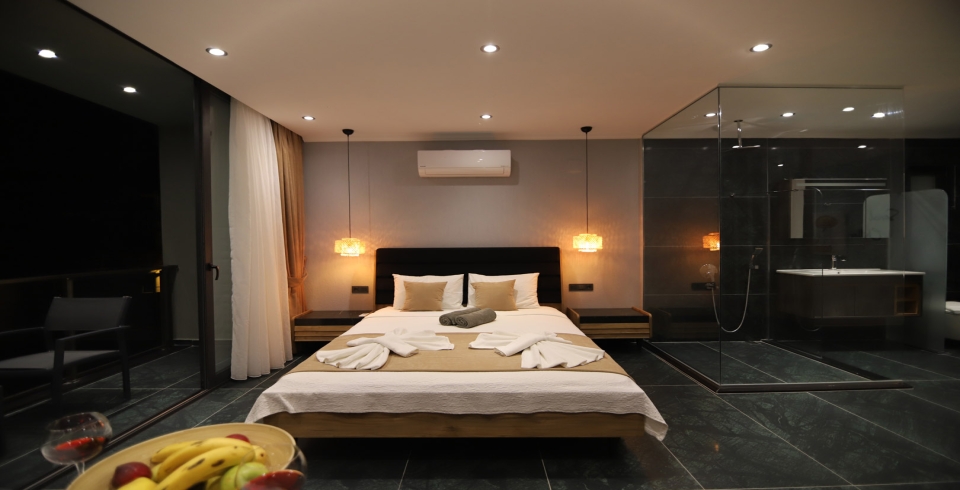 Yatak Odası : 1 adet çift kişilik yatak, klima, komodin, elbise dolabı, jakuzi, banyo ve tuvalet bulunmaktadır.