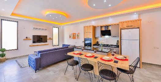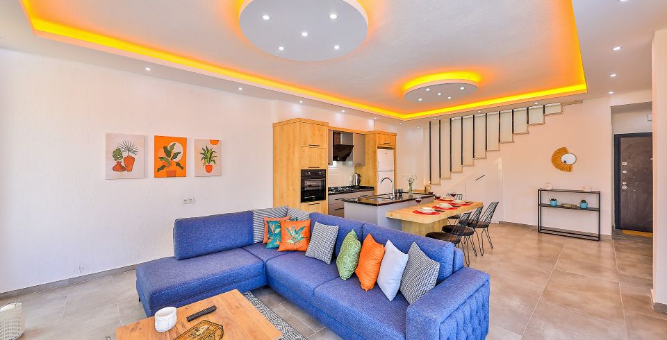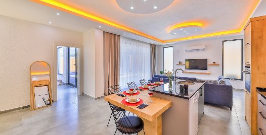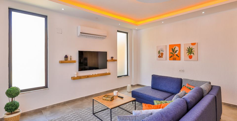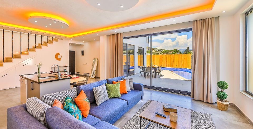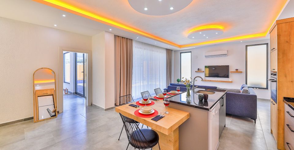 Salon : Salon içerisinde oturma grubu, tTV, klima, sehpa bulunmaktadır. Havuz terasına çıkış yapılabilmektedir.
