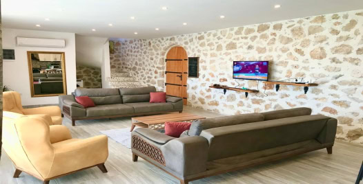 Salon : Villamızın iç dizaynı da son modaya uygun olarak modern bir şekilde tasarlanmıştır. Çeşitli dekoratif eşyalarla süslediğimiz salonumuz havuzlu bahçeye açılıyor. Villa salonunda oturma grubu, TV, internet, klima ve sehpa bulunmaktadır.