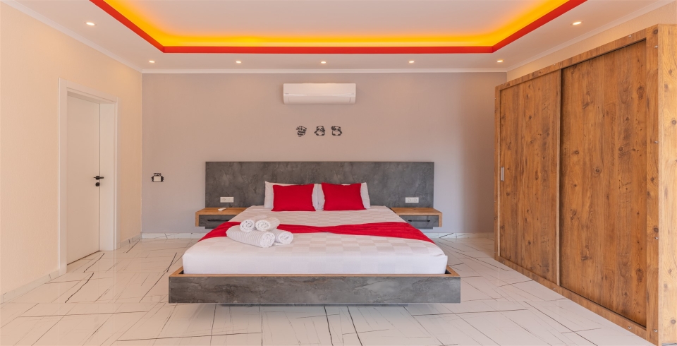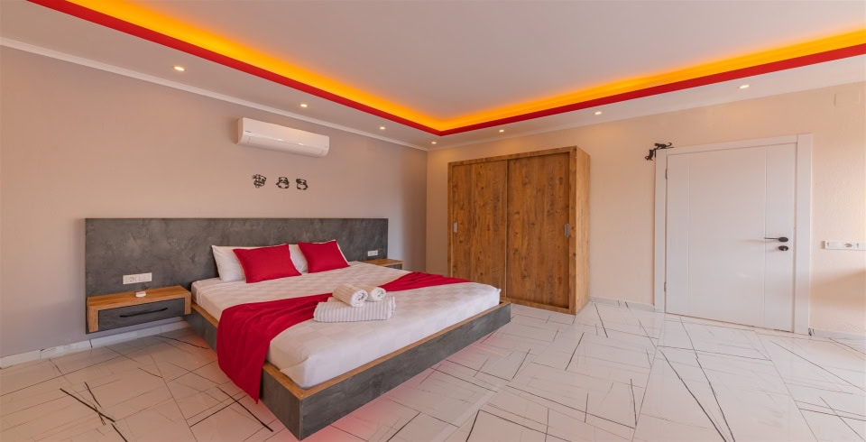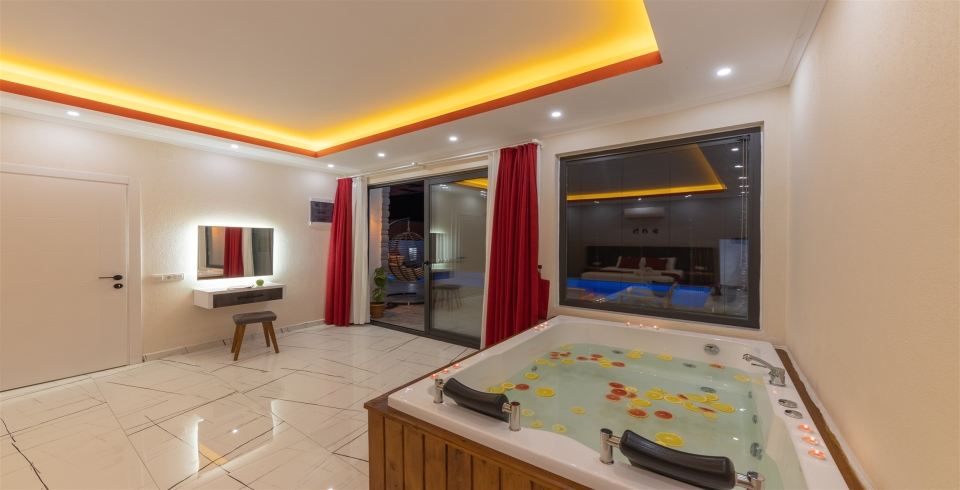 Yatak Odası : 1 adet çift kişilik yatak, televizyon, klima, jakuzi, komodin, elbise dolabı, makyaj masası, banyo ve lavabo bulunmaktadır.