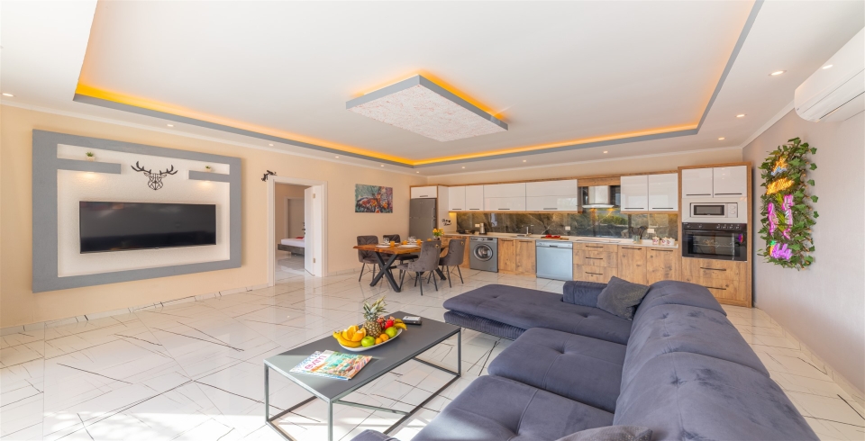 Salon : Villamızın salonunda sizi şık bir oturma grubu ile klima, televizyon, internet, uydu, koltuk, sehpa ile ferah bir salon bekliyor olacaktır. Havuz terasına çıkış yapılmaktadır.