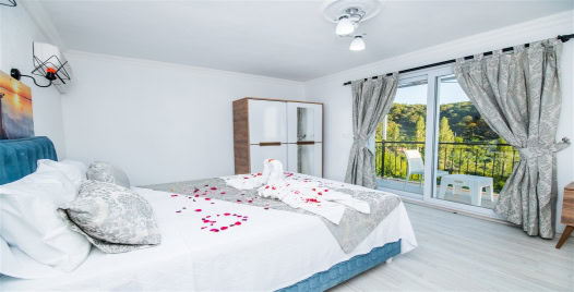 1. Yatak Odası : İki kişilik yatak,Jakuzi,Klima,Komodin,Makyaj masası,tuvalet ve banyo bulunmaktadır.