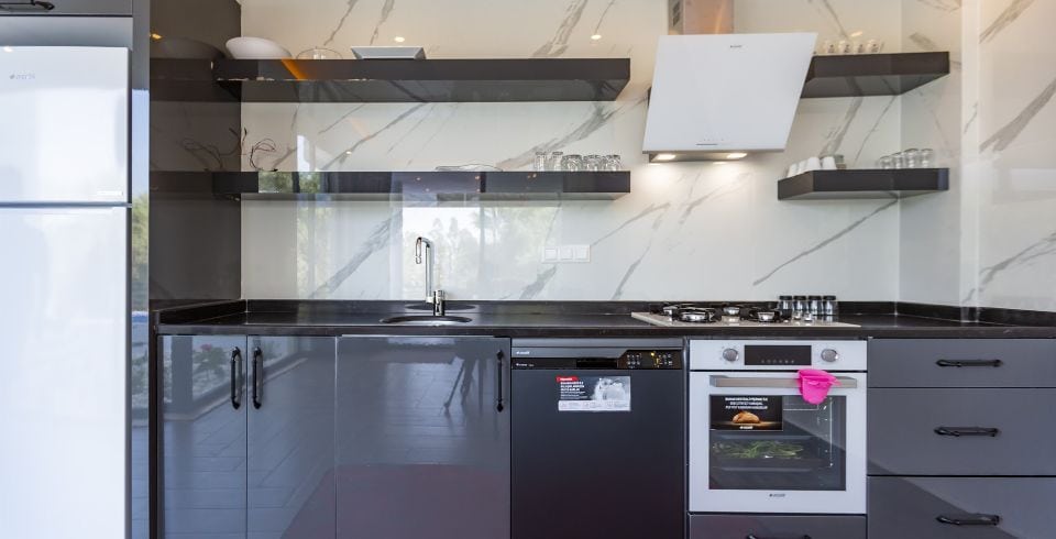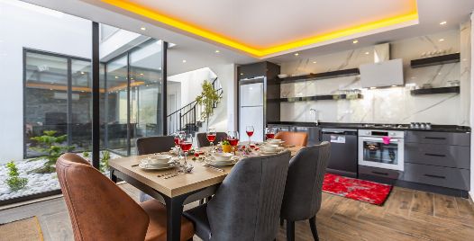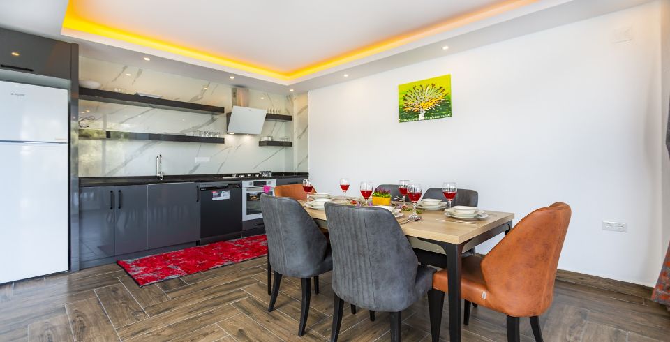 Mutfak : Her odamıza gösterdiğimiz özeni mutfağımızda da esirgemedik ve iç mimari tasarımı ile yemek yapmak daha da keyifli hale geliyor. Geniş yemek masası bulunan modern Amerika mutfağımızda buzdolabı, çamaşır makinesi, mikrodalga fırın, 4’lü ocak, elektrikli su ısıtıcısı, 5 kişilik yemek takımı, tencere-tava takımları, bardaklar, çatal-bıçak takımları gibi gerekli tüm mutfak araç-gereçleri bulunmaktadır.