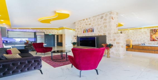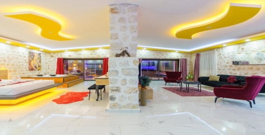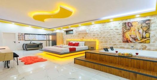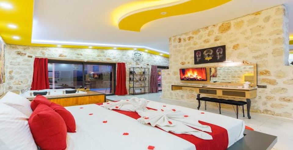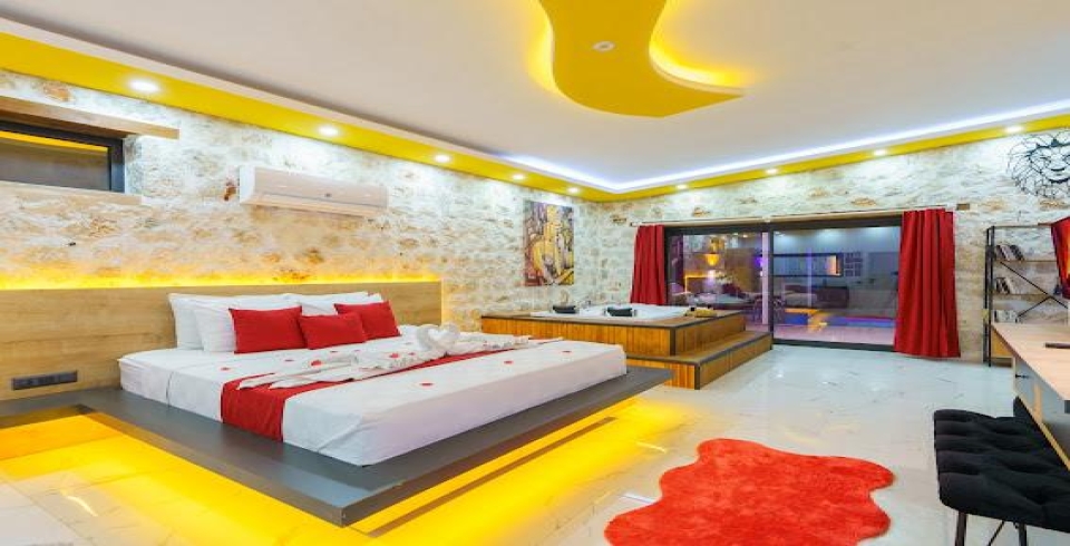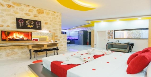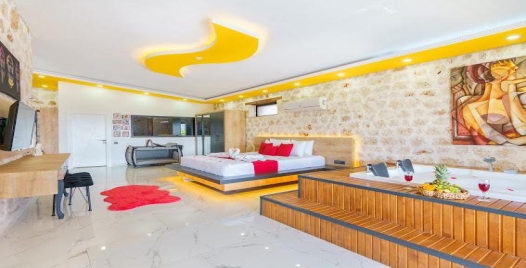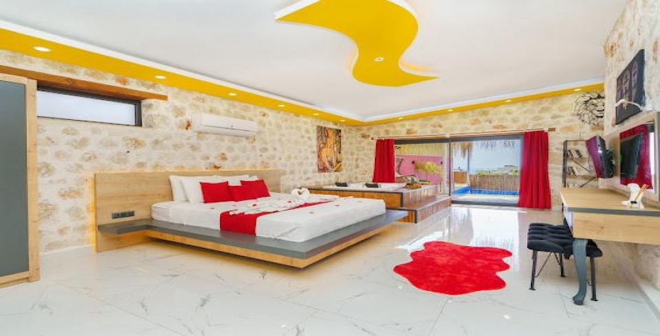 1.Yatak Odası: 1 adet çift kişilik yatak, elbise dolabı, komodin, klima, makyaj masası, TV, jakuzi, banyo ve lavabo bulunmaktadır.