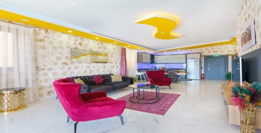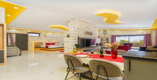 Salon: Özenle döşenmiş salon, modern koltuklar, 2 kişilik yemek masası, LCD TV ve klima, banyo, lavabo bulunmaktadır.